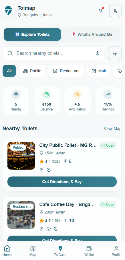 Toimap upgrades existing vendor-owned toilets into hygienic, standardized facilities through sub-leasing, rebranding, and professional maintenance. The platform enables easy discovery, scheduled cleaning, quality checks, and pay-per-use access, ensuring reliable sanitation for users while improving utilization and revenue for vendor partners through a scalable, asset-light model.