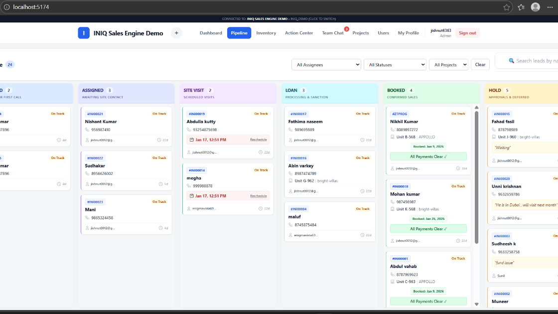 INIQ is a configurable, multi-tenant software ecosystem designed specifically for the Indian real estate industry to manage sales, operations, partner collaboration, and post-sales customer engagement on a single integrated platform.
