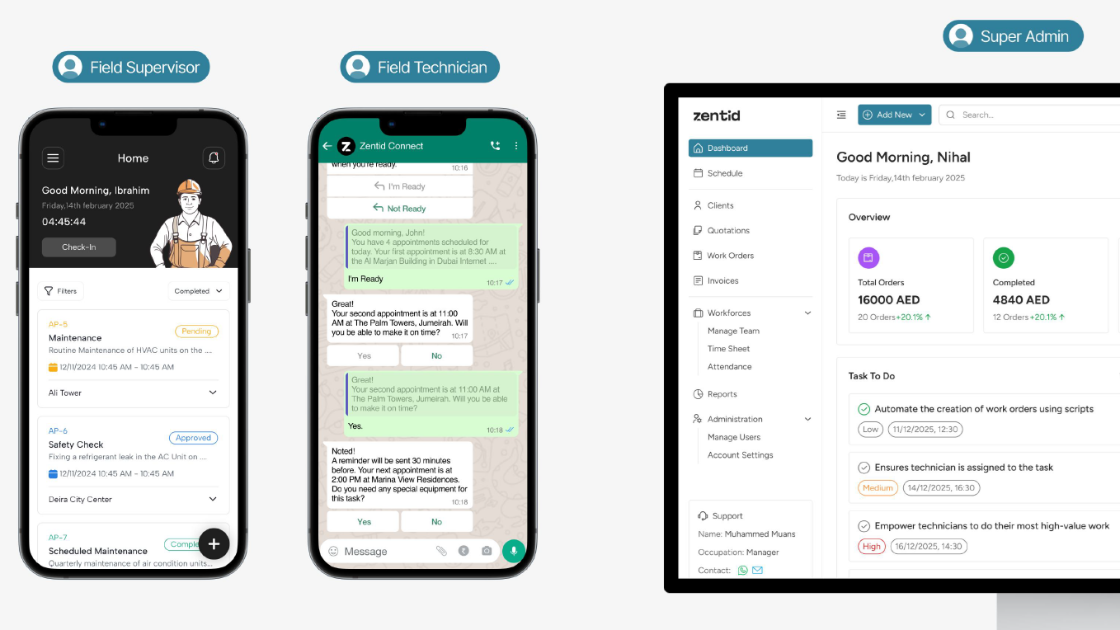 Zentid is a cloud-based Field Service Management platform designed for SMEs in maintenance, installation and service sectors. It simplifies operations through automation, smart scheduling and WhatsApp-based communication bridging office teams, supervisors and field technicians in one unified system.